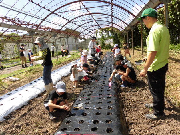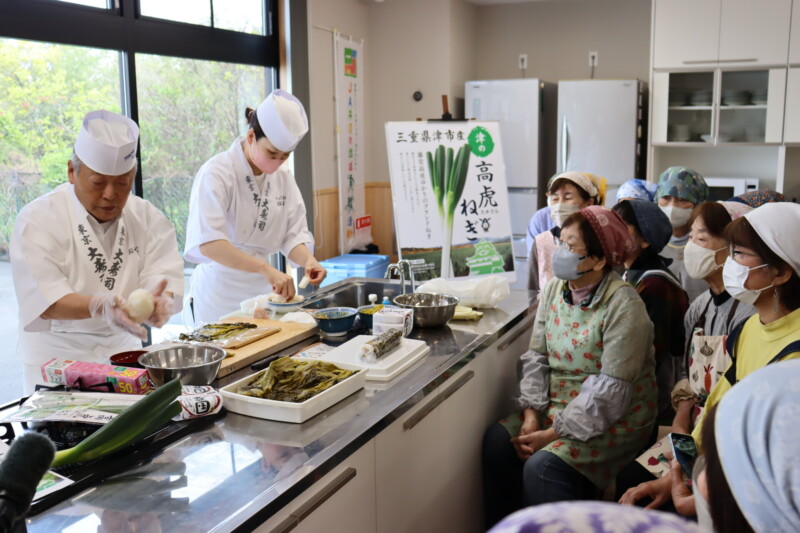 イベント前半は、深見さんがクイズを交えながら藤堂高虎の足跡や市の歴史をわかりやすく紹介。続いて、松田さんが45年前に考案した「高虎巻き」の作り方を実演しました。「高虎巻き」は、高虎の「高」にちなみ、高菜で巻いた巻きずし。同JAブランドの白ネギ「高虎ねぎ」と米「至福の一杯」、納豆、ナガイモなど地元食材を使用し、自宅でも簡単に作れるレシピとして紹介してくれました。参加者は、具材がこぼれないように巻きすでしっかり包みながら、巻きずし作りに挑戦していました。