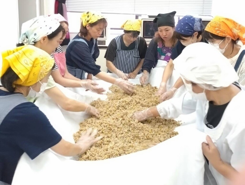 JA京都にのくに女性部綾部加工グループは2025年7〜8月、「もろみ作り教室」を3回にわたって開催し、女性部員41人が参加しました。材料は国消国産にこだわり、豆は同グループが栽培したものを使うなど、すべて国産でそろえました。同加工グループのメンバーを講師に、参加者全員で豆の皮をむいて大麦やもち米とともに蒸し、蒸しあがったものに麴菌を振り、もろみ作りのための麴を造りました。年齢や経験に関係なく、会話が弾み楽しく作業を進めた参加者。「一人ではできないけど、みんなですると楽しい。手作りっていいね。できあがりが楽しみ」と終始笑顔でした。