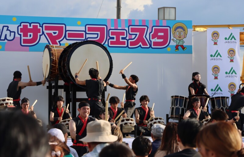 JAならけんは2025年8月、組合員や地域住民に楽しんでもらおうと、橿原(かしはら)市のファーマーズマーケット「まほろばキッチン」橿原店でサマーフェスタを開き、約3500人が来場しました。同JA経営管理委員会の村本佳宜会長は「まほろばキッチンは今年でオープンから12年めを迎えた。今日は熱中症に気をつけながら、夏休みのひとときを楽しんでもらいたい」と挨拶。ステージでは奈良県立奈良商工高等学校和太鼓部「和太鼓秋篠」の演奏やキャラクターショー、風船職人によるバルーンショーが繰り広げられました。