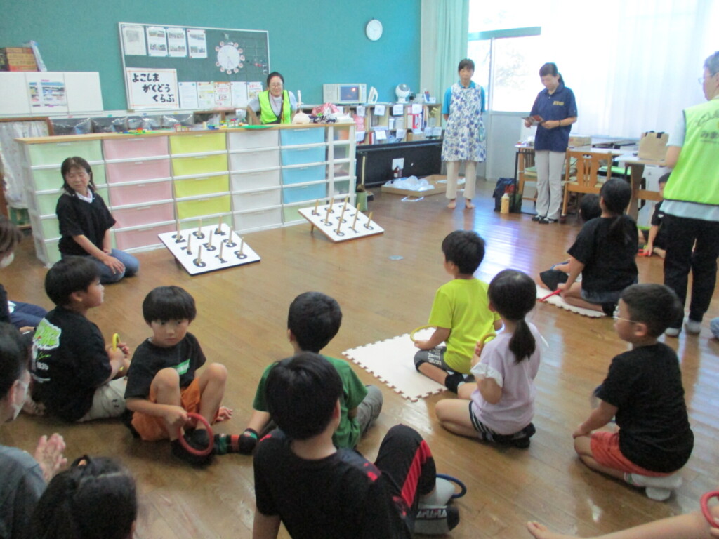さらにその後は輪投げ大会で盛り上がり、子どもたちと女性部員との交流がさらに深まりました。子どもたちから「固まったらどうなるか楽しみ」、「お母さんがこの石けん汚れがよく落ちるって言ってた」などのうれしい声が聴かれ、部員からは「子どもたちから元気をもらえた」との声が上がりました。