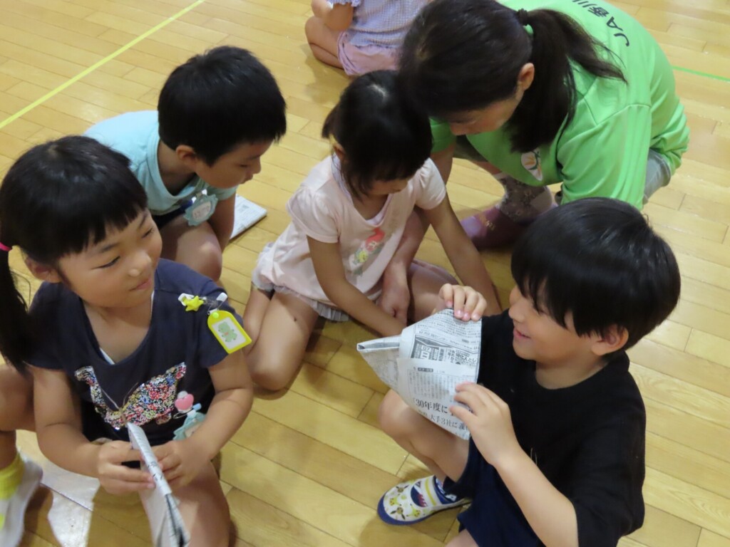 また、新聞紙を再利用した、便利袋の折り方を子どもたちに伝授。子どもたちは、できあがった便利袋にプレゼントのお菓子を入れたり、帽子にしたりとたいへん喜んでくれました。これからも出前授業を通して、地域の子どもたちとふれあい、女性の力で地域の活性化をめざしがんばっていきます。