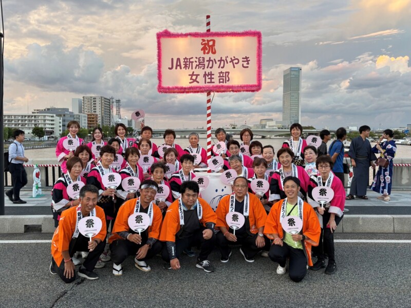 JA新潟かがやき女性部巻地区は、新潟まつりで2025年8月8日に開催された「大民謡流し」に参加しました。当日はJA新潟かがやき青壮年連盟巻支部の部員からも参加いただき、女性部員、事務局と合わせて31人でいっしょに踊りました。