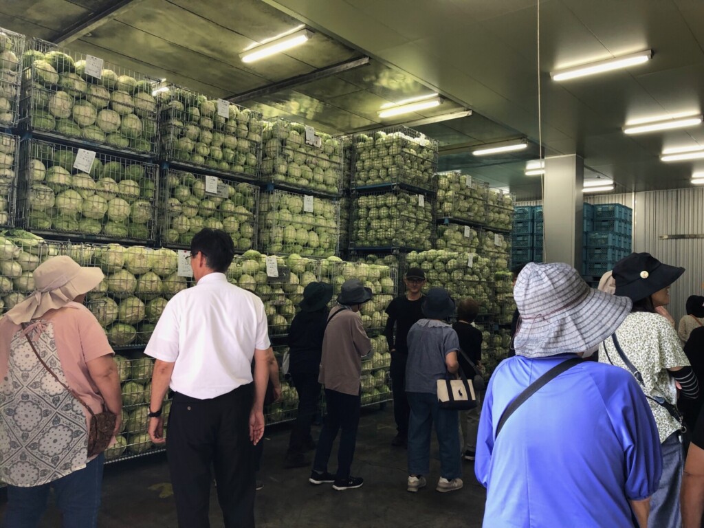 長野原町応桑地区にある野菜予冷施設を訪れたさいには、真空予冷庫の内部を見学しました。現地の職員から質のよい高原野菜の出荷に向けた取り組みについて説明を受けました。参加者の中には予冷庫に初めて入るという人も多く、天井近くまで積み上げられた野菜のコンテナに驚く様子が見られました。