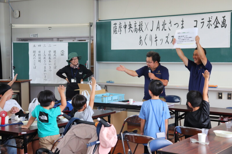 また、昼食の時間に合わせて、JA北さつま青壮年部が「野菜クイズ」を出題。ヒントとして、野菜の特徴やよく使われる料理などが上がると、子どもたちは元気よく手を挙げて答えていました。正解した子どもには、女性部特製の鹿児島県の郷土菓子「ふくれ菓子」がプレゼントされました。