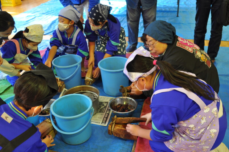 島根県益田市匹見町内谷地区で活動する「内谷(うつだに)とちの実会」(村上巴代表)は、毎年晩秋に「とちの実交流会」を開催しており、地元の小学生と地域の関係者らが、とちの実の皮剝きやきねによる餅つき体験をとおして交流を深めています。