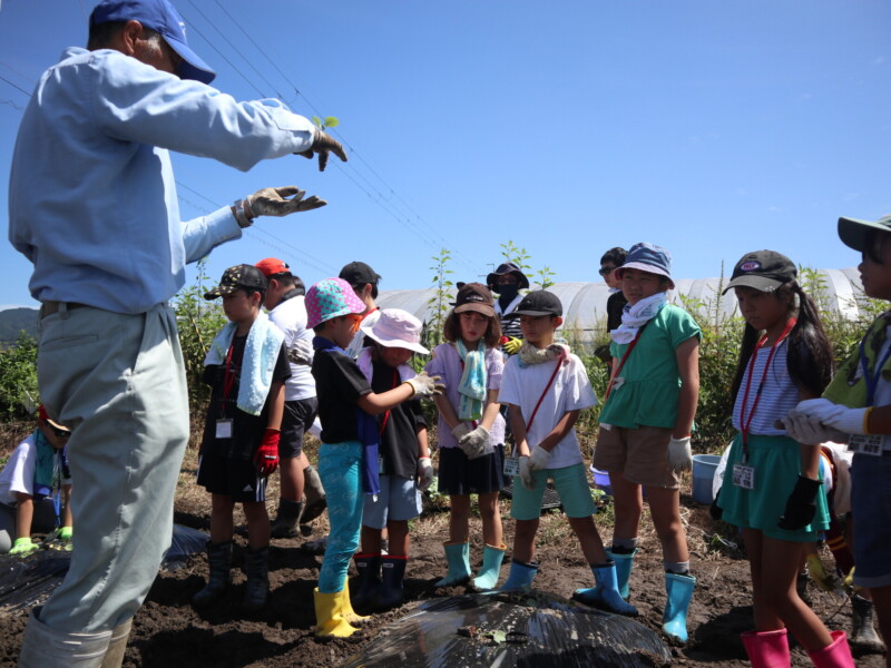 植えつけ作業では、子どもたちは圃場(ほじょう)に移動し、職員に教わりながら等間隔に穴の空いたマルチ畝に手掘りで定植。校長を務める髙田清隆統括部長は「当スクールを通じて食を育む田畑の背景にある動物や植物の命を感じてもらい、農業の果たす役割を学んでほしい」と話しました。