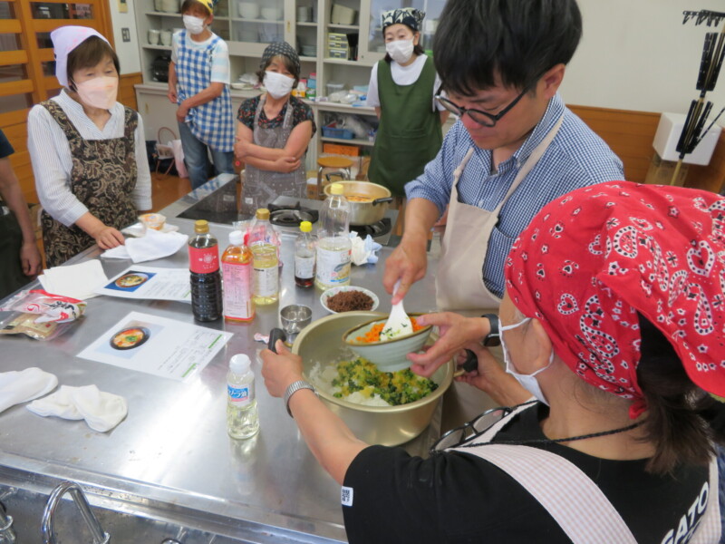 JAのと輪島女性部は2025年7月、輪島支店管内の各地区で、令和6年能登半島地震による震災後初めての活動となる酢を使った料理講習「酢的(すてき)健康生活講習会」を開催しました。「エーコープらっきょう酢」でおなじみの大興産業株式会社から講師を招き、「キンパ風混ぜ寿司」「なすと豚肉の玉ねぎソース焼き」「ピーマンと長いもの甘酢和え」「トマトと卵のサンラータン風」の4品を作りました。また、「お酢のある暮らし」として酢の効果や便利な使い方の説明もあり、調理後はみんなで試食。参加した女性部員は「料理のレパートリーも増え、おいしくできた」と喜んでいました。