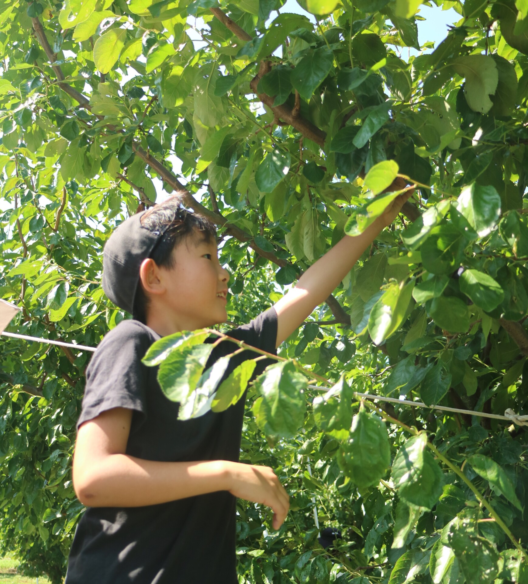 JAながのは、2025年8月下旬、准組合員の子育て世代を対象にした「農産物収穫体験」を開催しました。今年で4年めの取り組みとなり、今回は、20〜40代の親子13組47人が須坂市の畑でプルーンを収穫しました。会場を訪れた親子は、初めて見るプルーンの樹に興味津々の様子でした。