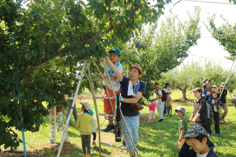 園主から、品種紹介や生育状況についての説明と収穫方法を聞き、参加した子どもらは、枝になっているプルーンを親の手を借りながら収穫しました。参加者は「プルーンを初めて収穫しました。子どもたちは木になっていることも知らなかったので勉強になった。甘味と酸味のバランスがよく、とてもおいしいです」と話しました。