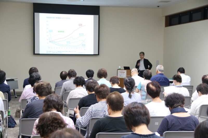 そのほか、定期的な有酸素運動で硬くなった血管を柔らかくすることや、高齢者は低栄養であることが多いので65歳以上の人はいろいろな食品を摂取すること、肉などのタンパク質をしっかり摂取することがだいじだということもわかりました。幅広い内容と分厚い資料には驚きましたが、その一つ一つがとてもだいじなのだと気づかされました。わかりやすい講師の説明に、参加者のみなさんは興味深く耳を傾けていました。