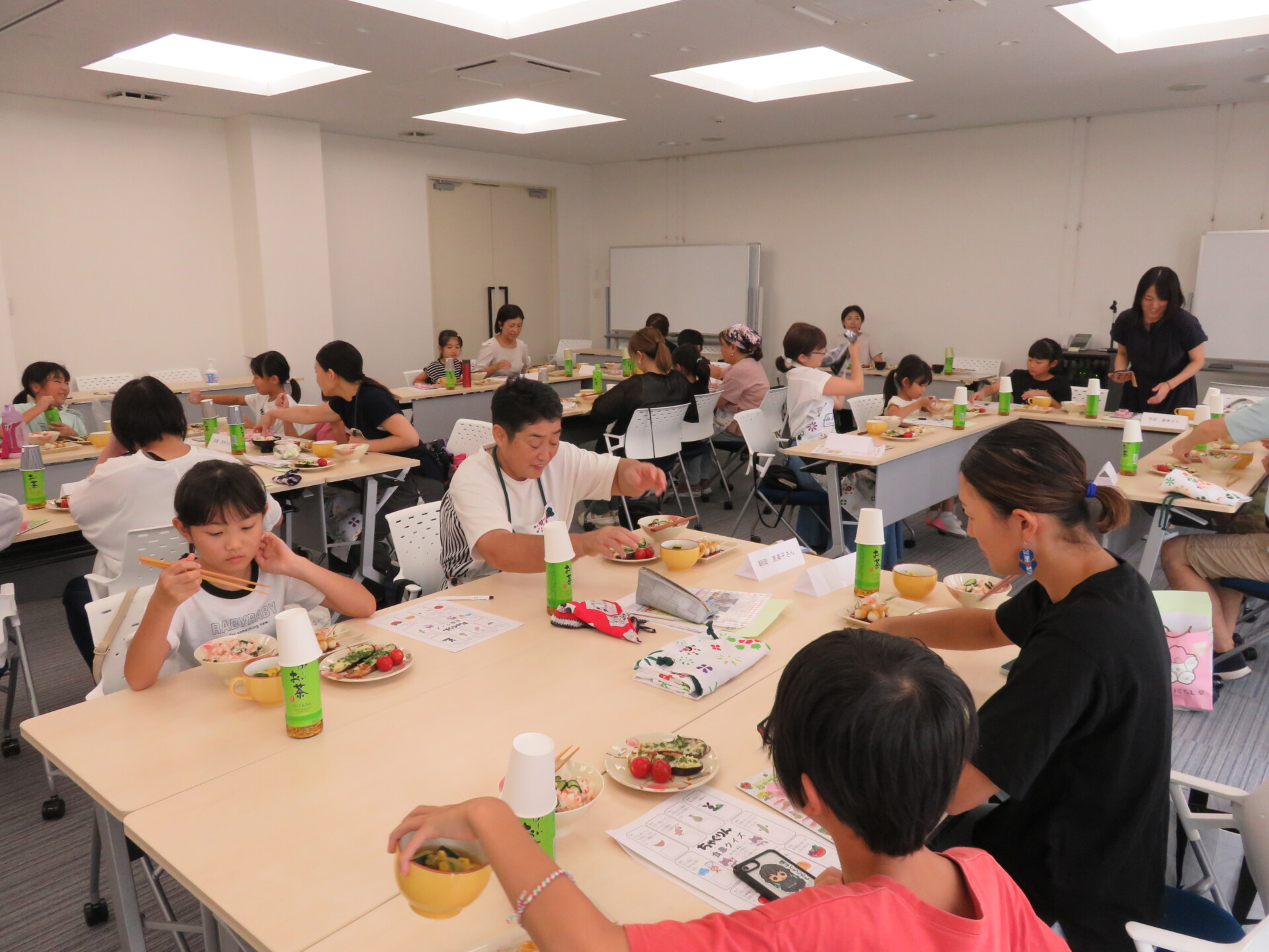 参加者は子どもといっしょに作れるメニュー4品に挑戦。「サケとキュウリの混ぜずし」「ナスとチーズのステーキ」「夏野菜のカレースープ」「みたらしだんご」の調理を楽しみ、試食したあとには食農に関するクイズを10問出題し、解いてもらいました。