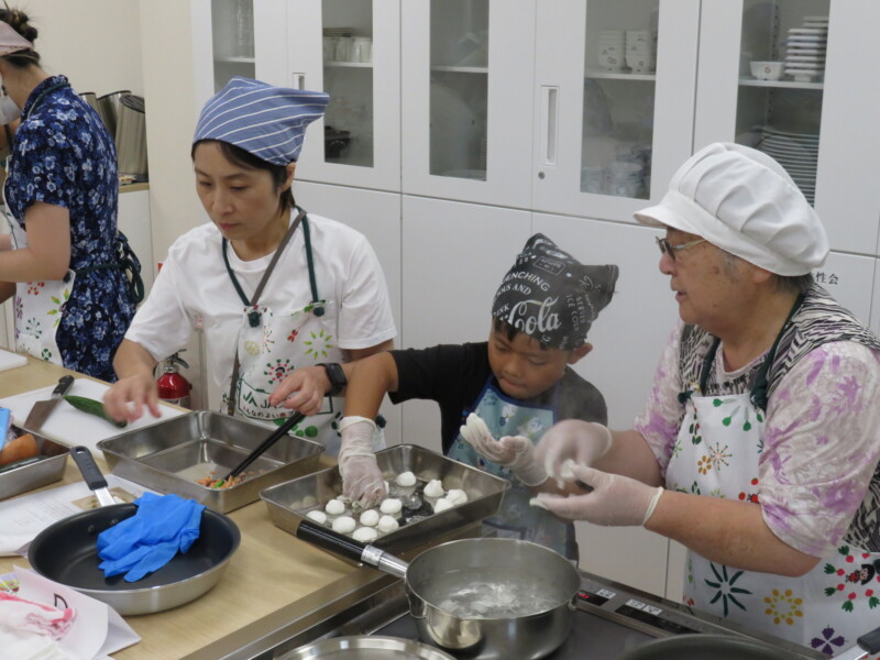 岩倉会場では9組18人の親子が、向日会場では11組25人の親子が参加しました。講師は女性部の各支部長が担当。また、各調理台には一人ずつ女性部員を配置し、計8人がサポートに務めました。