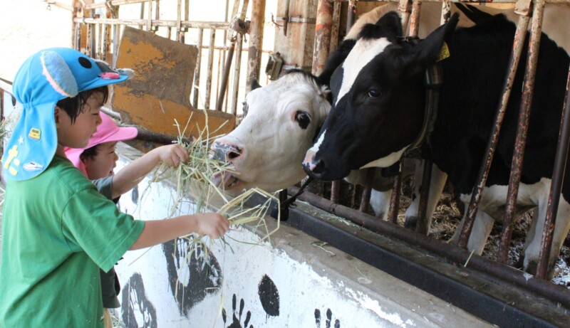 参加した16世帯の親子46人は、2班に分かれて、農業施設と畜産施設を交互に見学しました。農業施設では、農業機械の見学とラジコン草刈り機の操縦を体験。畜産施設では、ブラッシングや餌やりを体験し、乳牛とふれあいました。