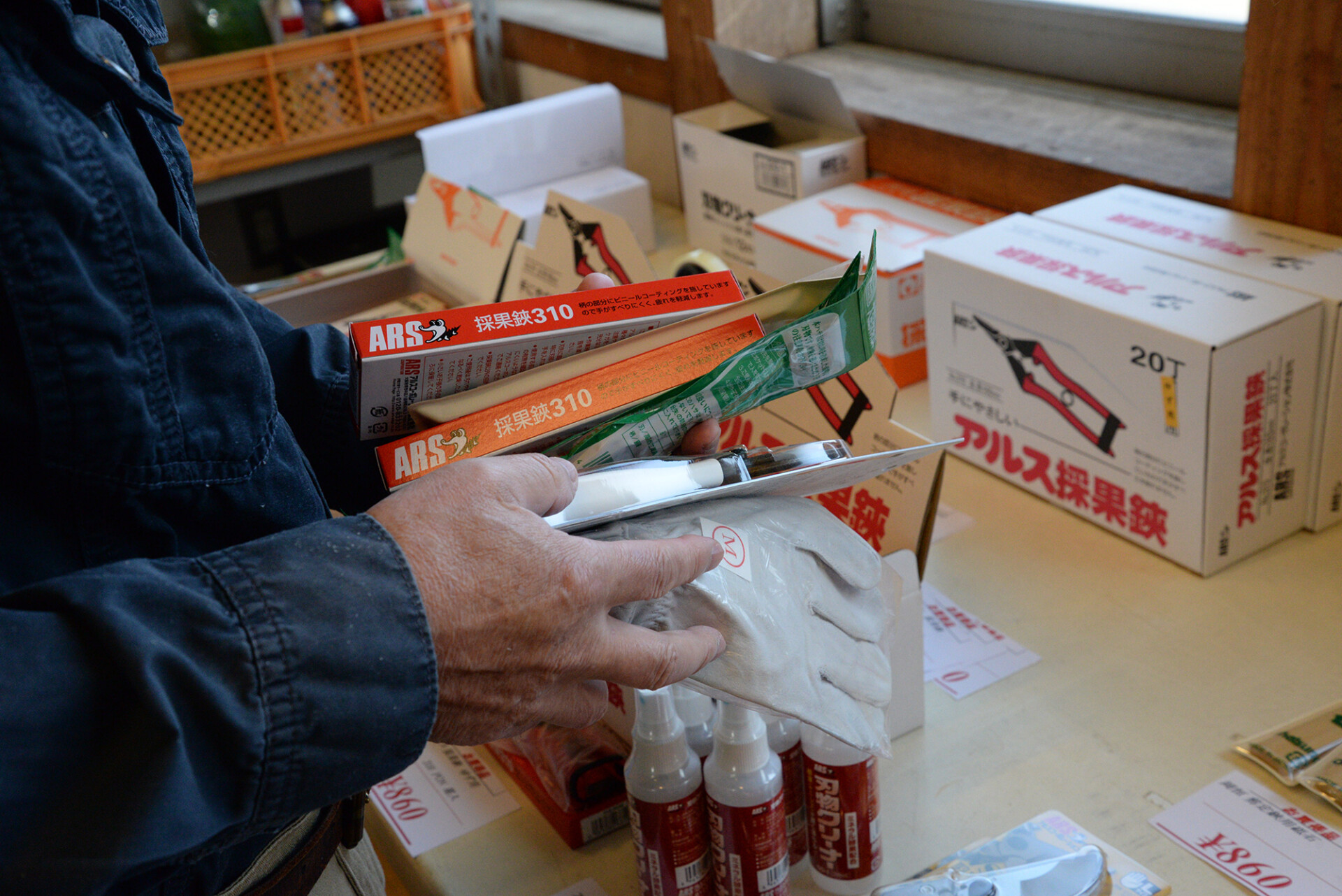 農家さんたちは、商品を手に取って試したり、大小比べてみたり、メモに書いていない物まで吟味してみたりと、楽しそうです。既存の持ち物に愛着はあるものの、新しい物も気になる様子で、「家にも売るばぁ(売るほど)あるけんど!」と、大笑いしながら、新しい道具を新調していました。
