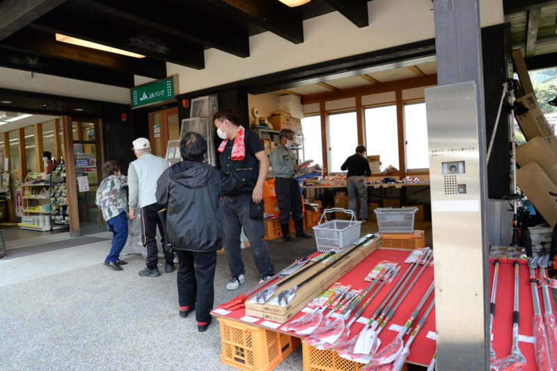ユズの収穫を目前に、JA馬路村Aコープの店舗前で、ユズ収穫道具の特売がおこなわれました。馬路村には、農業に関する道具を取り扱っているお店がAコープしかないため、毎年、専門の道具屋さんを村に招いて、販売してもらっています。