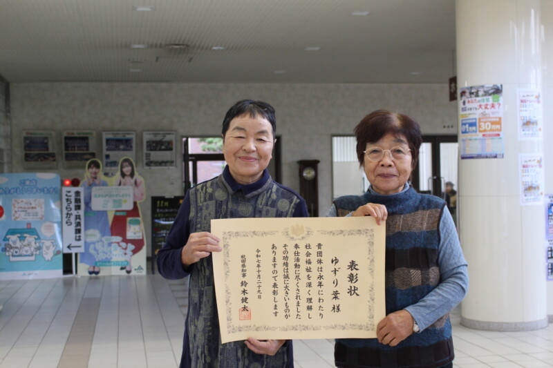 2025年10月29日は、長年にわたり社会奉仕活動を行い、その功績が顕著な団体であるとして、「ゆずり葉」が、秋田県社会福祉大会において県知事表彰を受けました。当日は、代表の内田ノブさんの代理として副代表・佐藤美和子さんが表彰状を受け取りました。