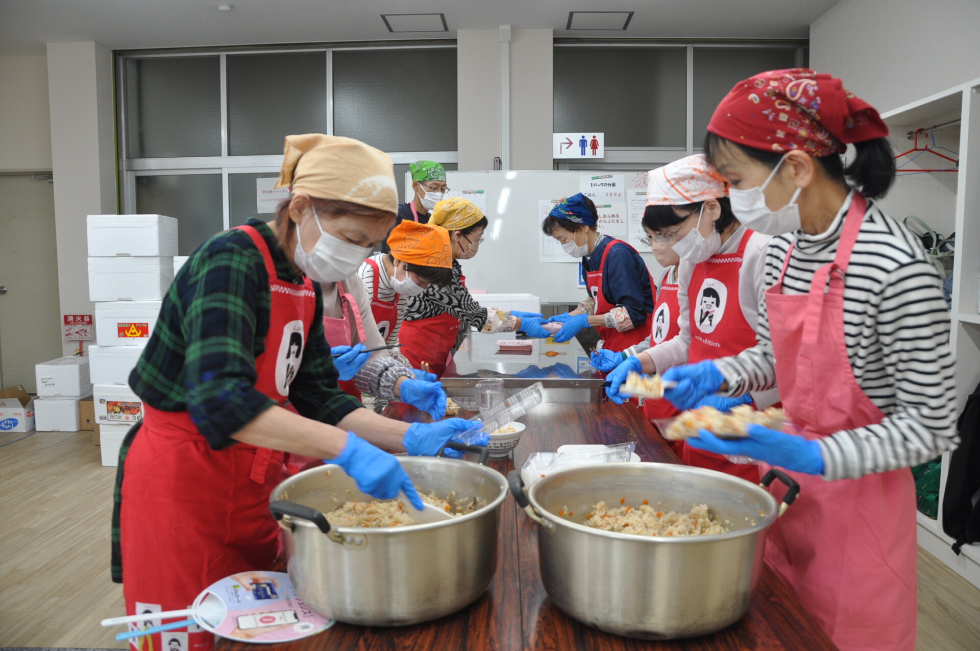 炊き込みご飯の調理には、2日間で総勢約50人の部員と事務局が協力して取り組みました。そのかいあって、今年は約1,550パックを用意し、多くの方に手に取っていただくことができました。