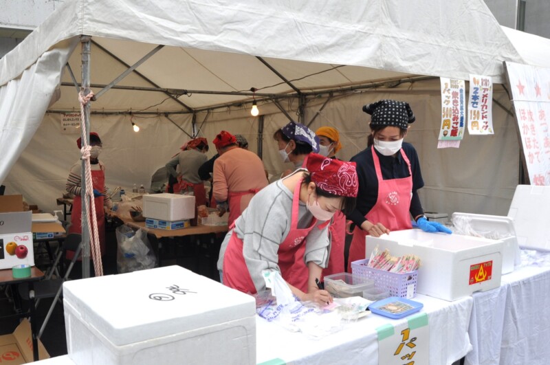 同女性部では、炊き込みご飯の調理・販売を通じた米消費拡大や地産地消の推進に力を入れています。また、アメリカンドッグや手作りの焼き肉のタレ、廃油石けん、アクリルタワシなども販売し、JAまつりを盛り上げました。