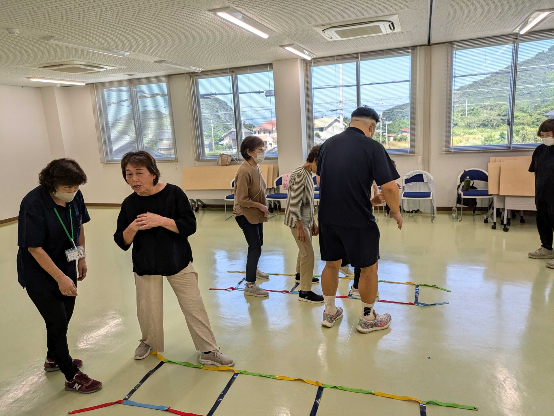体を動かしながら頭(脳)も使っていきますが、ついつい迷ってしまう足元にまわりからの声援が飛び、うまくできれば達成感で自然と笑顔になります。この動作こそがコグニサイズそのもの。参加者からは「激しい動きじゃないし、考える時間が楽しい、答えが違っても楽しい」と好評でした。次回の健康教室も企画中です。