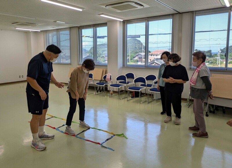 JA福井県女性部敦賀美方(つるがみかた)支部みはま地区では2025年10月、理学療法士を講師に迎え、コグニサイズ(認知症予防運動)を体験しました。ラダー(はしごのように等間隔にます目が並んだひも状のもの)を床に置き、1で右足、2で左足、3で一歩右足を前に出す、4で右足の隣に左足を出します。次は数字を色に変えて声を出しながら、「赤! 右足」「青! 左足」と続けます。