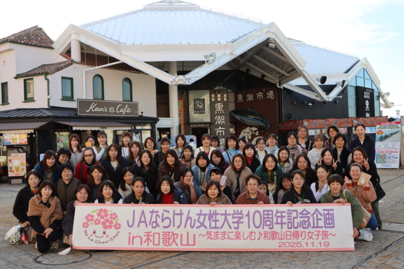 JAならけんは2025年11月、16年から取り組んでいるJA女性大学「Na La Chou-Chou」(ナ・ラ・シュシュ)が10周年の節目を迎えたことを記念して、特別企画「気ままに楽しむ♪ 和歌山日帰り女子旅」を開催しました。この企画は、JAとのつながりを再確認するとともに、次世代女性リーダーの育成と地域社会での女性の活躍促進を図ることを目的に、1期から9期までの卒業生と25年度に受講している10期生の交流の場として実施したもの。60人ほどが参加し、和歌山県日高川町にある道成寺(どうじょうじ)で絵とき説法を聞いたほか、ミカンの収穫体験や黒潮市場訪問など、一日を通して親睦を深めました。