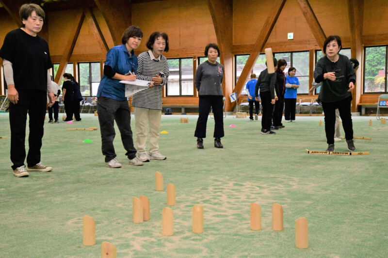 モルックは、モルックという棒を投げてスキットルという木製のピンを倒し、得点を競うスポーツ。倒し方によって得点の仕方は異なりますが、先に50点ピッタリに得点したほうが勝ちというルールです。当日は管内各地区から女性部員48人が参加し、16チームによるトーナメント方式で楽しみました。