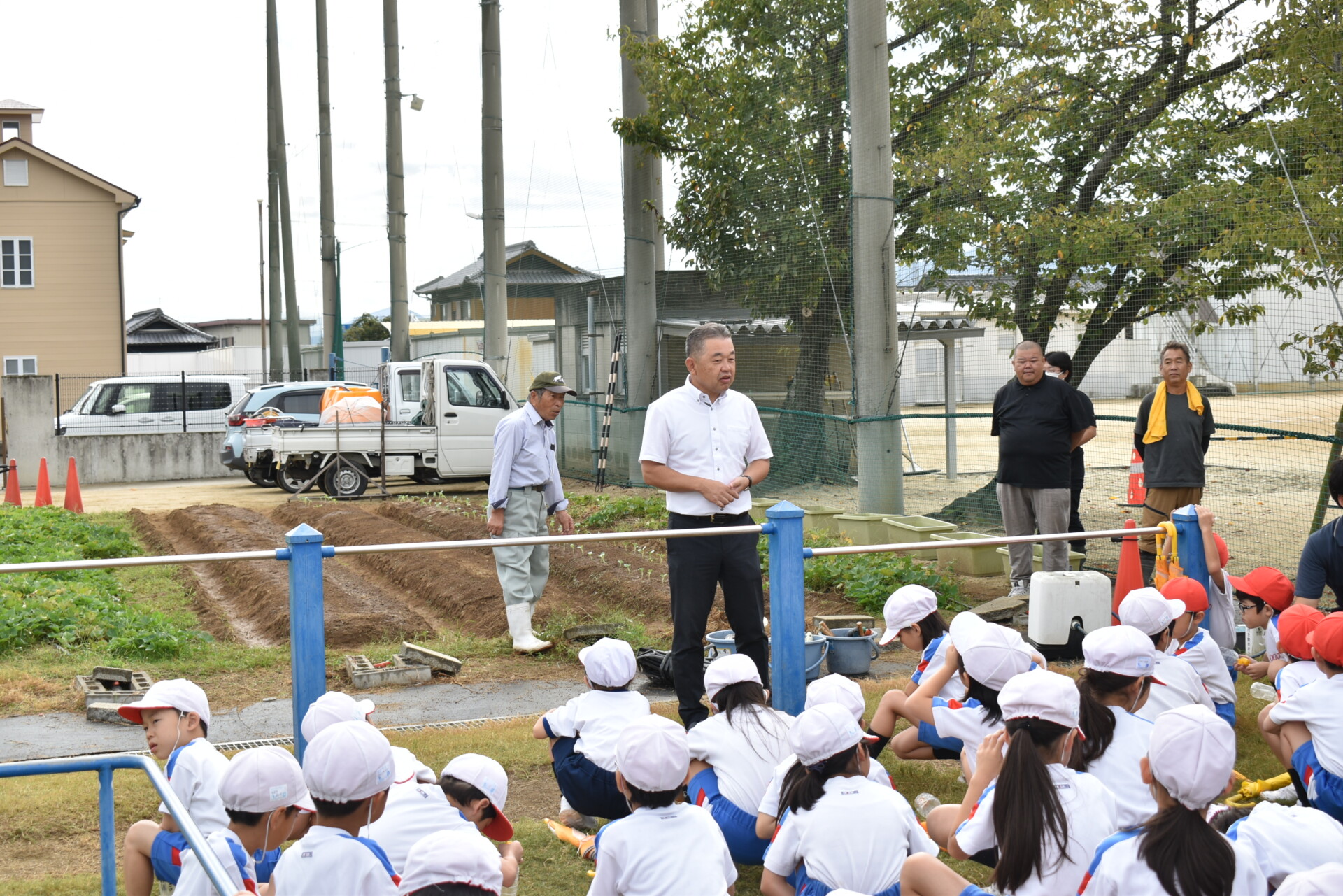 この活動には講師としてJA香川県高松南部地域運営委員会の山西博幸委員長、同JA青壮年部十河支部の谷川武支部長ら部員2人、同JA高松南部十河支店職員1人、同JAふれあいセンター職員2人が参加。児童にブロッコリーの苗を植える場所や、ダイコンの種をまく深さなどについて指導しました。児童らは指導に沿ってブロッコリーの苗を植えつけ、ダイコンの種をまいて土をかぶせるなどして、農作業を楽しみました。