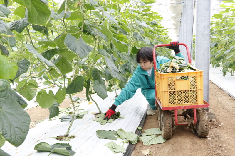 生徒はキュウリの出荷荷造りや、ハウス内で摘葉後の葉の片つけなどを体験。「作業をすると、同じ態勢が長く続くことが多い。実際の作業のたいへんさがよくわかる」などと感想を話しました。