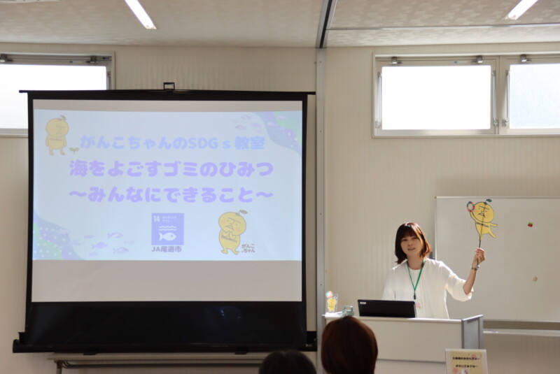 イベントには、JA尾道市公式キャラクター「がんこちゃん」が登場。海のごみ問題やプラスチックによる環境への影響をわかりやすく説明し、海洋ごみの現状やわたしたちにできる身近な行動について考える機会となりました。