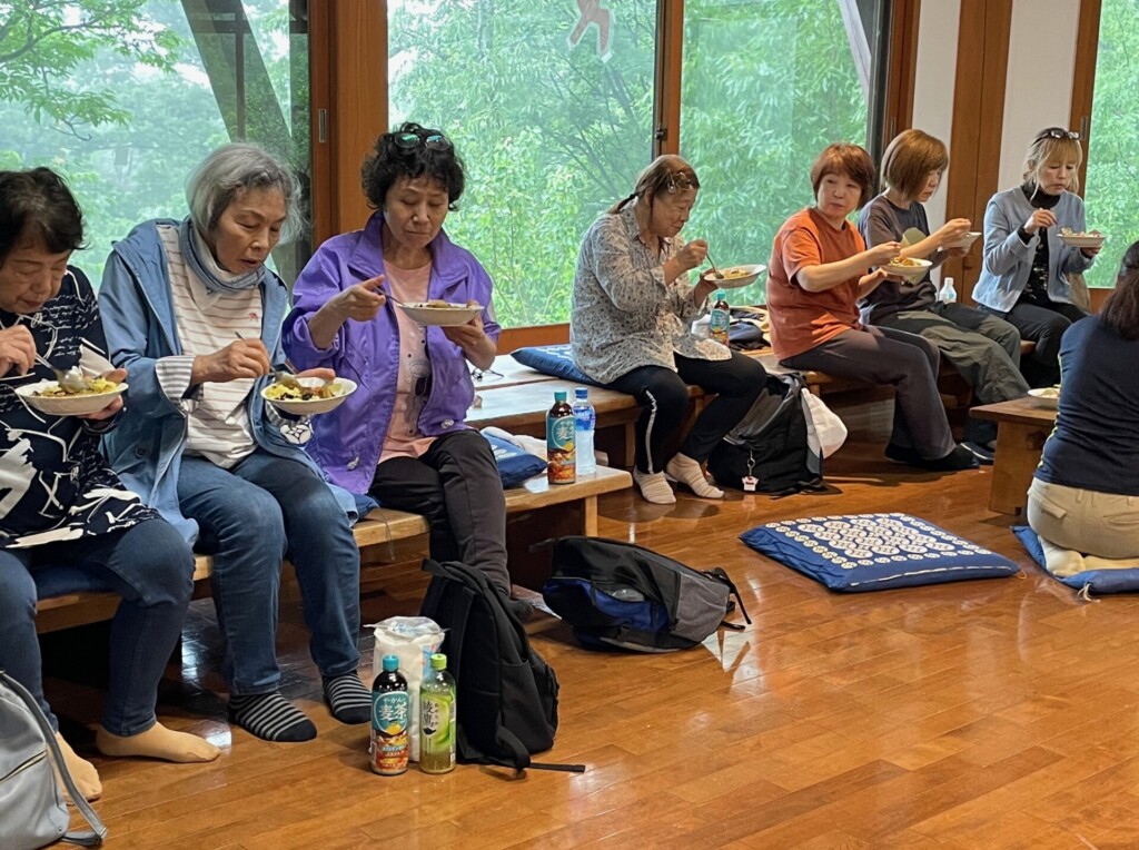 当日は豊かな自然に囲まれながら散策するコースを予定していましたが、あいにくの雨だったため屋内で健康体操をすることに。講師の指導の下、フレイル予防のための筋力運動やストレッチで汗を流し、「家でも継続してやっていきたい」と健康への関心が高まりました。体を動かしたあとは、みんなでカレーを食べながら会話を楽しんだり、抽選会をおこなったりして参加者同士の交流を深めました。