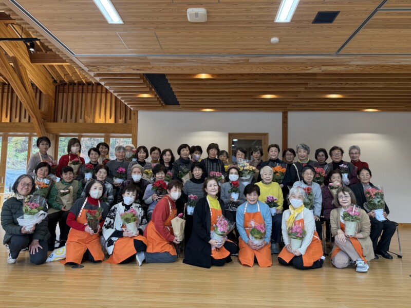 JA小松市女性部では毎週1回、市内5か所で元気高齢者が集う「ふれあいルーム」を開催しています。ふれあいルームでは15人のボランティアスタッフが約50人の利用者といっしょに体操や手芸、お茶会、ゲームなどを企画し、楽しくフレイル予防に取り組んでいます。2025年11月には木場潟(きばがた)公園東園地で全5か所のふれあいルーム利用者が一堂に集う交流会を開催しました。