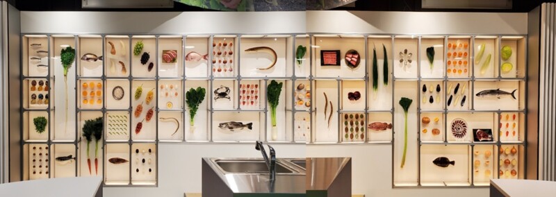 ちなみに展示サンプルは「なにわの伝統野菜」の吹田慈姑(すいたくわい)、服部越瓜(はっとりしろうり)、高山牛蒡(たかやまごぼう)、大阪しろな、守口大根(もりぐちだいこん)、勝間南瓜(こつまなんきん)、金時人参(きんときにんじん)、天王寺蕪(てんのうじかぶら)、田辺大根(たなべだいこん)、難波葱(なんばねぎ)、「なにわ特産品」等の能勢栗(のせぐり)、泉州(せんしゅう)たまねぎ、泉州さといも、大阪ふき、泉州キャベツ、泉州水なす、大阪もも、大阪みかん、大阪こまつな、大阪なす、大阪いちじく、えびいも、八尾えだまえ、春菊、大阪ぶどう(デラウェア・ピオーネ・シャインマスカット・ポンタ〈虹の雫〉)、そのほか大阪で生産されているイチゴ(ちはや姫)やカキ、キウイ、フルーツパプリカ(ぱぷ丸)などが制作されました。