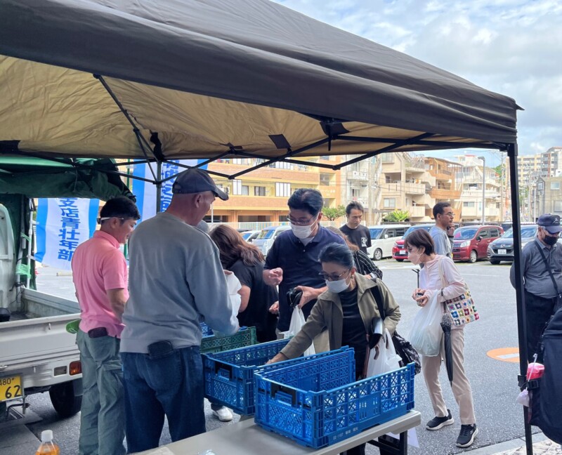 南部地区の各支店から12人の盟友と軽トラック6台が集結し、ブランド野菜の「ぐしちゃんピーマン」やレタス、インゲンなど旬の新鮮な農産物を対面で販売しました。会場では、販売開始を待つ人で行列ができ、販売時間を3時間と予定していたところ、約1時間で完売となるほどの盛況ぶりでした。購入者特典として小禄支店青壮年部が生産したタマゴを200パック用意し、来場者へ振る舞いました。