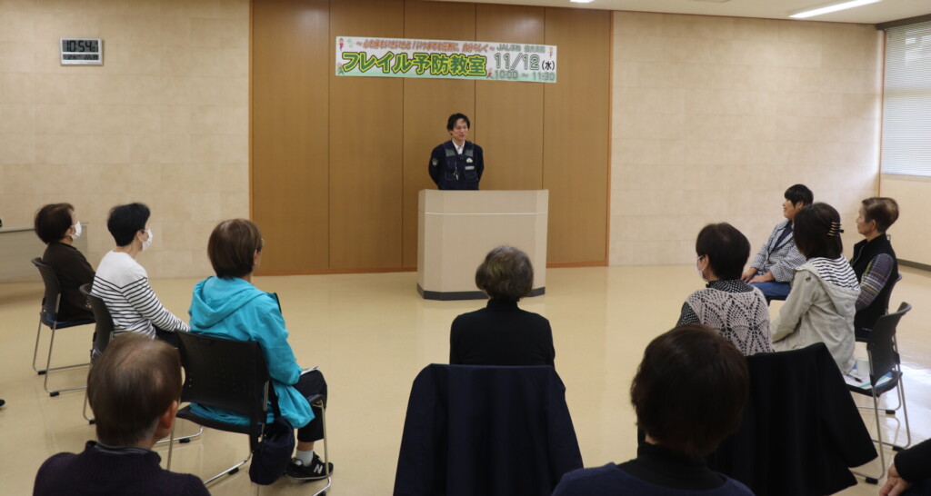 JAしまね伯太(はくた)支店は2025年11月12日、管内組合員18人を対象にフレイル予防教室を開催しました。フレイルとは、加齢による筋力の衰えや心身の活力・認知機能の低下に伴う、介護が必要になりやすい虚弱な状態のことを表します。同教室はJA職員が講師となり、フレイル予防の3本柱である、”栄養”、“運動”、”社会参加”、についての説明や、談笑を交えながらの運動をおこないました。