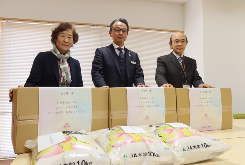 JAの亀子組合長と出口女性部長が木曽郡上松町にある養護老人ホーム「木曽寮」の施設代表を訪問し、木曽社会福祉事業協会の田上理事長が木曽寮、上松荘、木曽ねざめ学園3施設を代表して寄贈品を受け取りました。「入所者の楽しみは食事であり、お米もタオルもほんとうにありがたい」と感謝していただきました。亀子組合長は「食は命の源。ささやかな活動だが細くとも長く続けたい」と話しました。