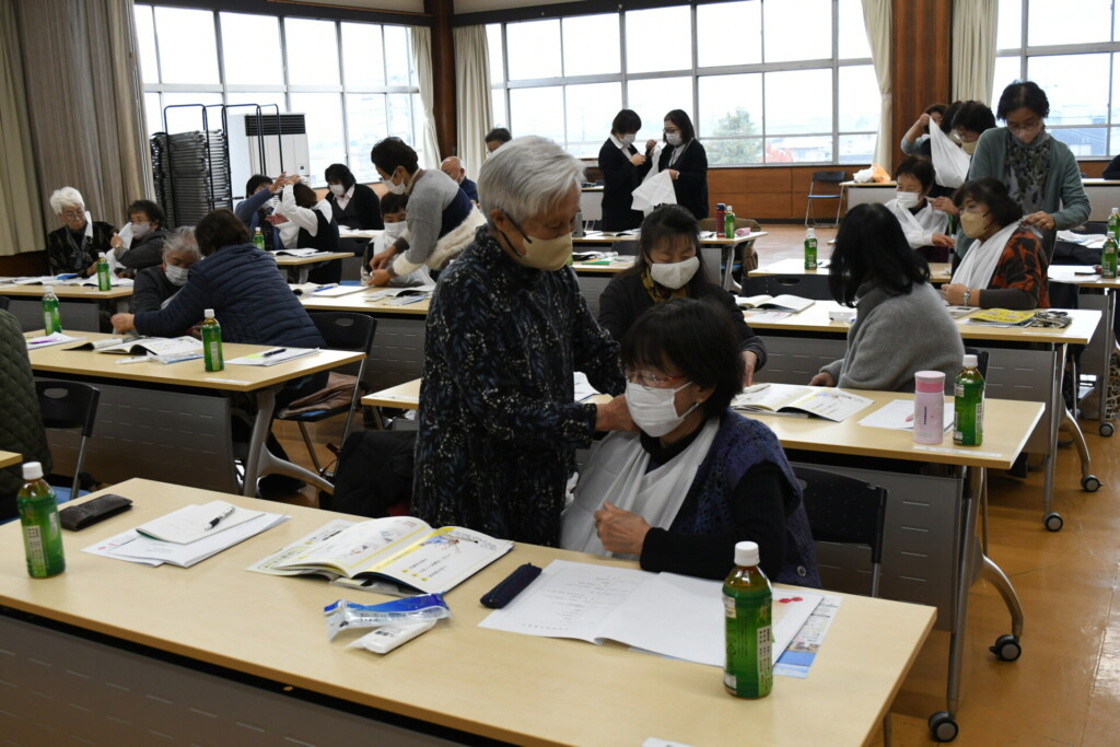 午前は、家の光協会職員を講師に『家の光』12月号を活用し防災セミナーをおこないました。講師自身の実体験の話や「いつも」の暮らしをひと工夫して、「もしも」のときに役立つ防災術や三角巾を使って腕や足首を固定する練習もしました。「孫のもしものときのために覚えたい」と何回も練習している役員さんもいました。