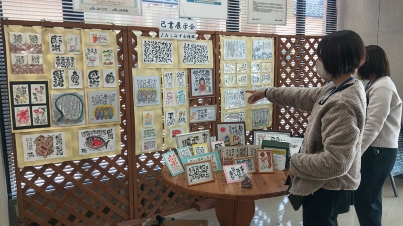 JAしみず女性部では、約半数の支部が己書(おのれしょ)サークル活動をおこなっています。この己書に親しむ女性部員同士が声をかけ合い、60点以上の作品を集めて展示会を開催。2026年1月6日から3月18日まで金融店舗や営農センターに特設ブースを設けました。