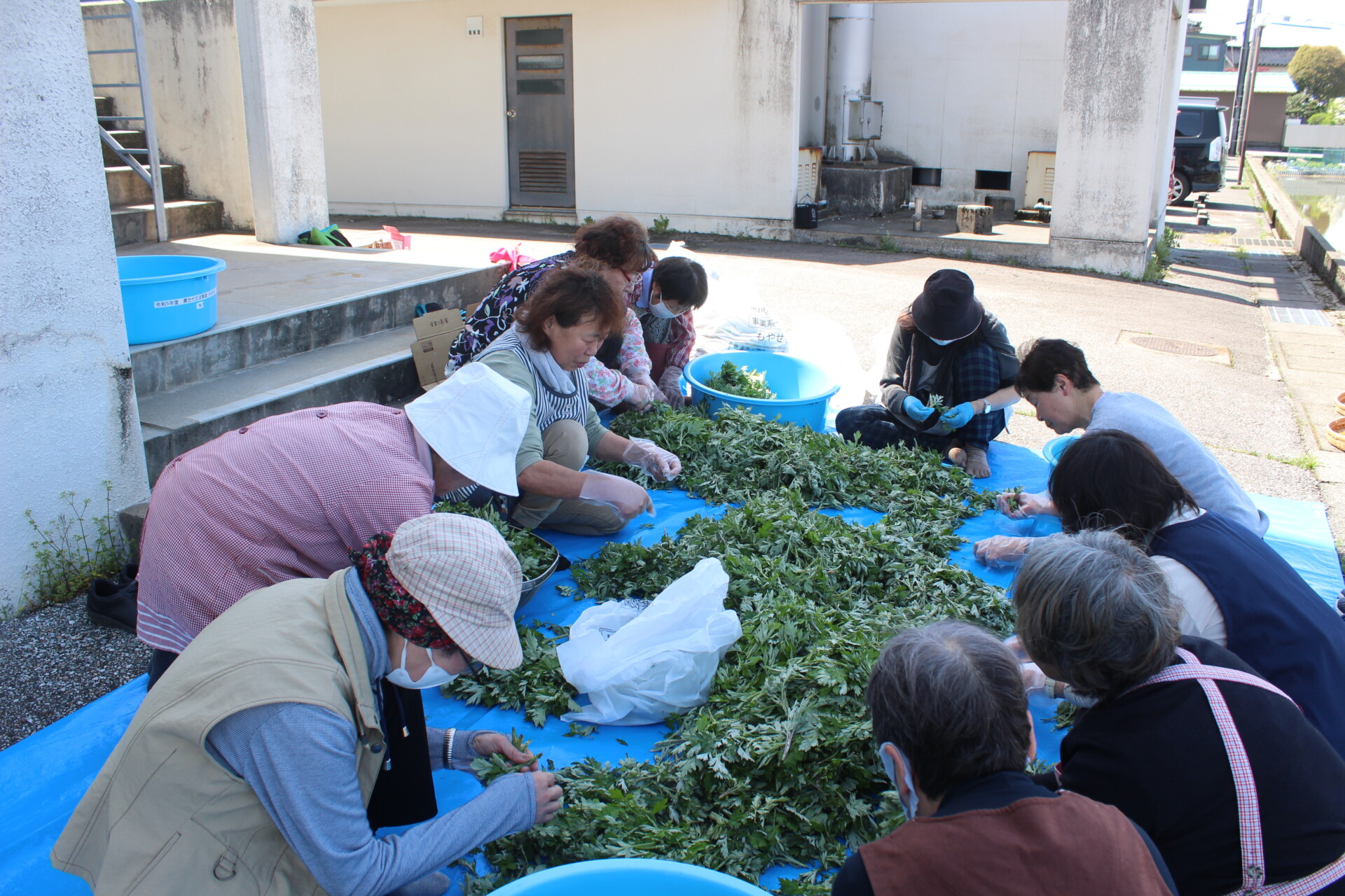 JAうおづ農業祭では毎年、女性部のブースで「焼きつけ」を販売しています。焼きつけは、もち粉にヨモギを合わせ、こねて焼き上げた富山県の郷土食です。昭和初期の食糧難の頃から食べられており、とくに農村で長らく親しまれてきました。材料のヨモギは4月ごろに自生しているものを一つ一つ手作業で摘み取り、11月の農業祭まで冷凍保存しておきます。そして、農業祭直前に地元の和菓子屋さんの協力の下、練り上げたもち粉とヨモギを木枠に入れて手で押し広げ、一口大の正方形にしていきます。女性部員たちは「ここの生地はもっとこっちに寄せて」などのやりとりや前年の農業祭の話をしながら、協力して焼きつけの準備に勤しんでいます。