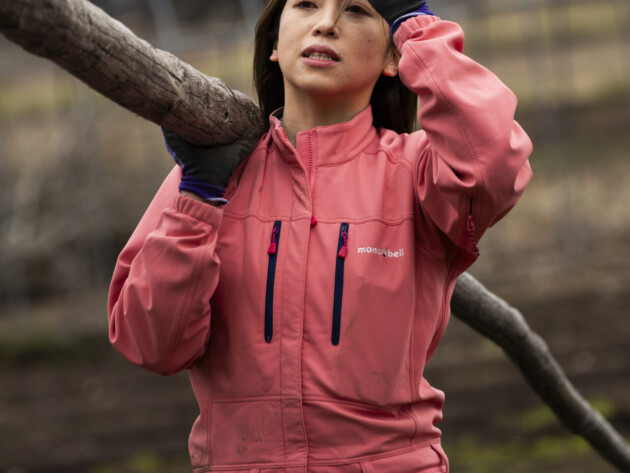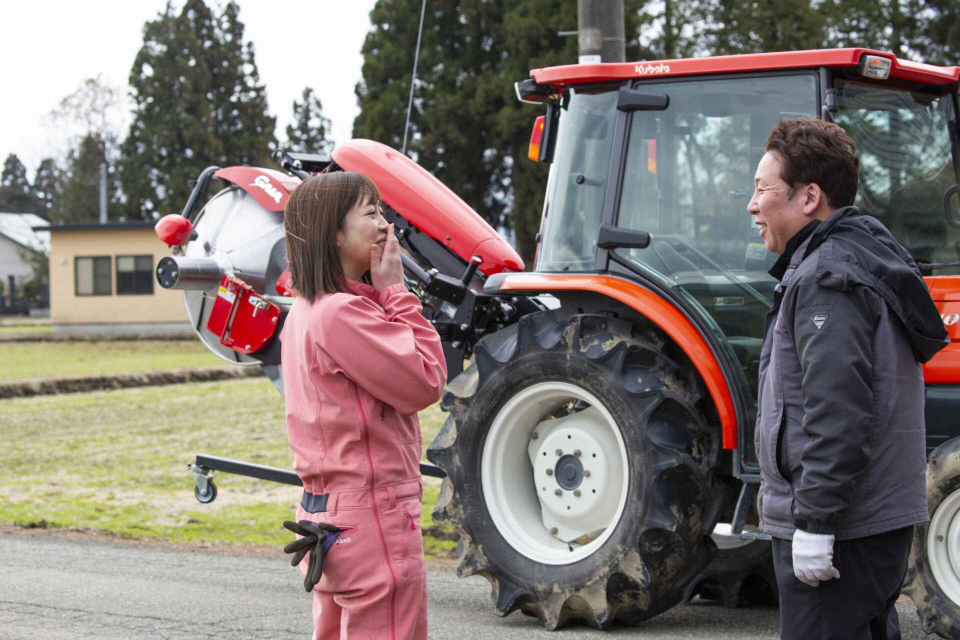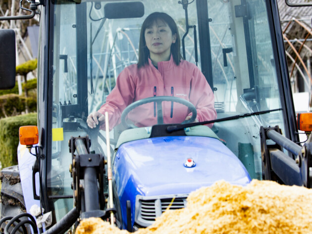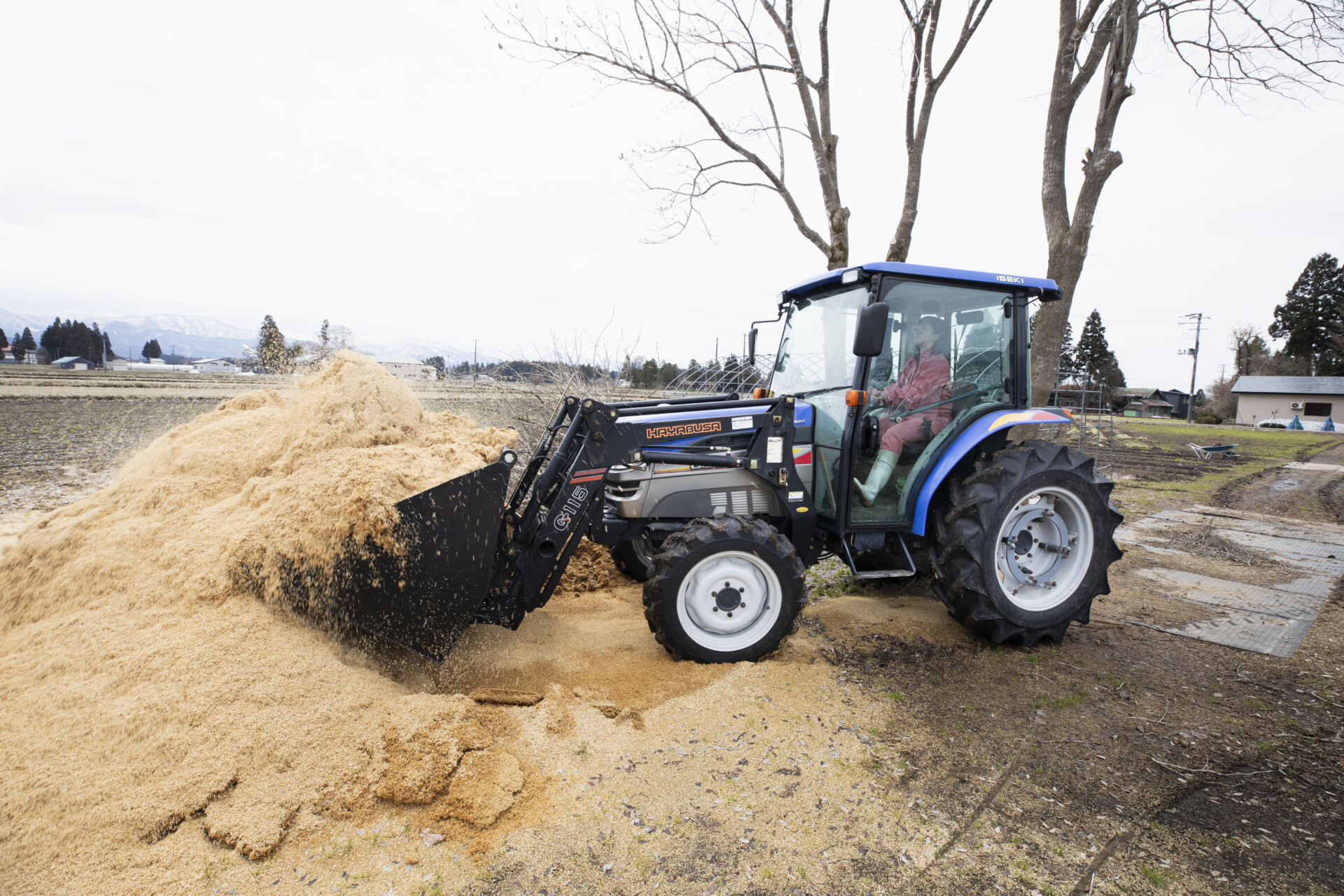 そう話すのは、アウトドアブランドのピンクのつなぎ服を着こなし、大型トラクターに乗り込む小松瑞穂さん(34)です。軽快に操って圃場へと移動。シャベルで、籾殻をまいていきます。大の機械好きで、運転はもちろん、小型農機のメンテナンスまでお手のものです。