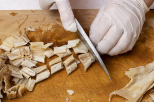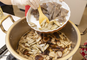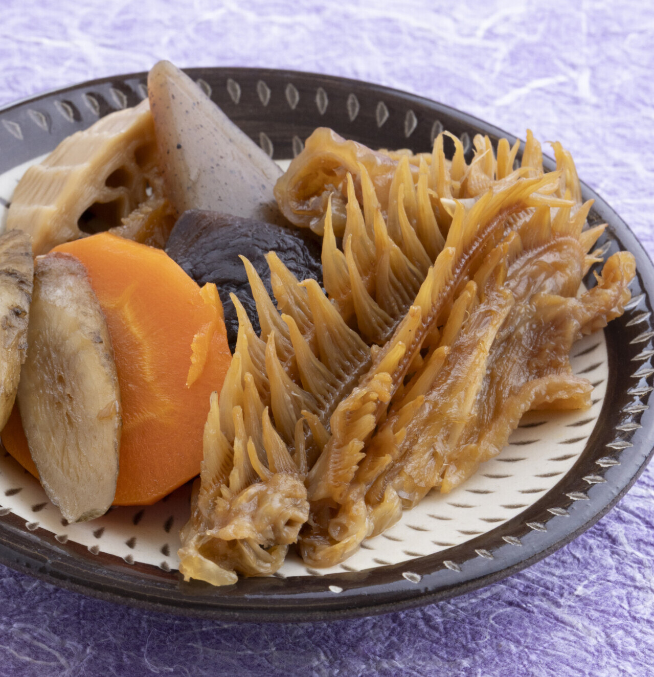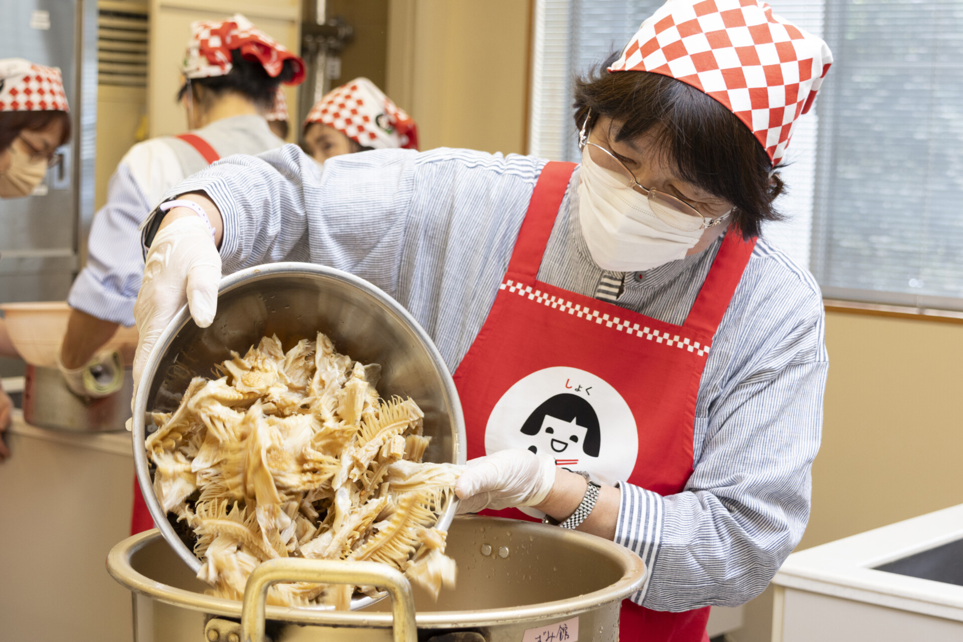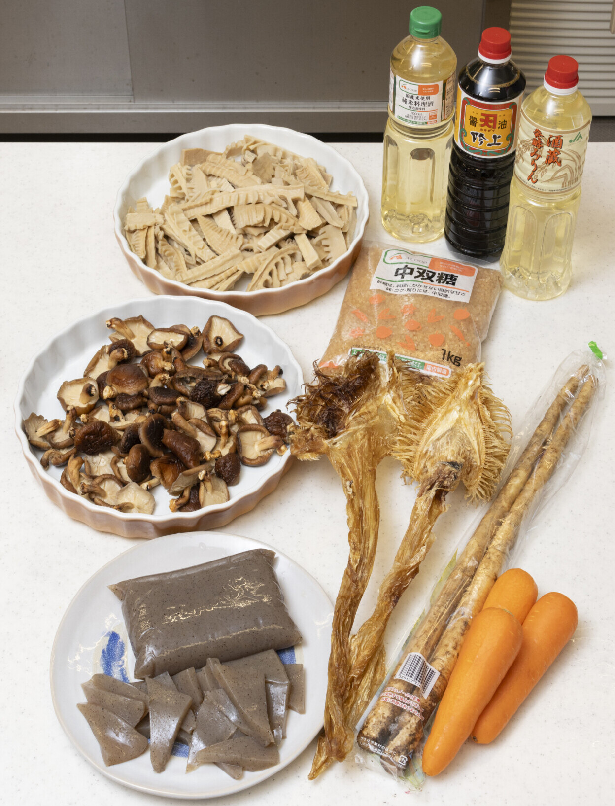 調理はまず、たらおさを水でもどす作業から始まります。常温の水なら、ときどき水を替えながら丸一日つけておき、カチカチだったたらおさが、クニャクニャと曲がるようになったら準備オーケー。一口大に切って、水とともに鍋に入れ、酒、砂糖、しょうゆ、みりんで甘辛く煮つけていきます。たらおさに味がついてきたら、その他の具材を投入。さらに一時間以上煮こみ、たらおさがやわらかくなったらできあがりです。