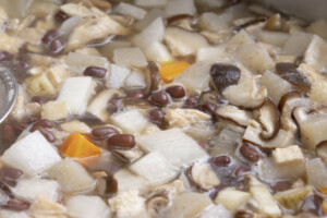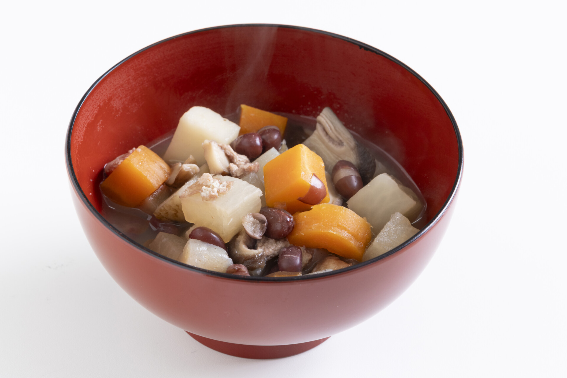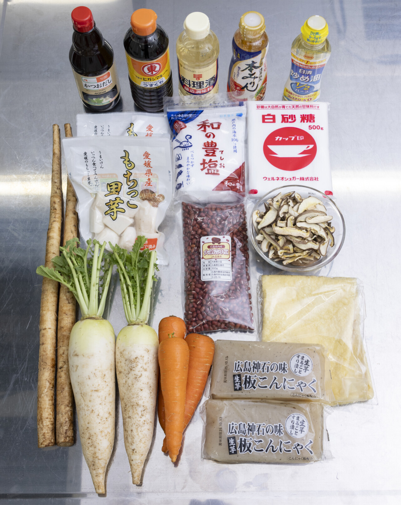 ❹ ②と③の材料を鍋に入れ、だし汁、調味料を加えて中火で30分ほど煮る。最後にアズキを湯切りしてから加え、全体がやわらかくなったら味をみて完成。