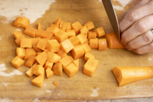 ❷ ゴボウ、ニンジン、ダイコン、サトイモの皮をむき、5~10mm角に切る。もどした干しシイタケも5~10mm角に切る。