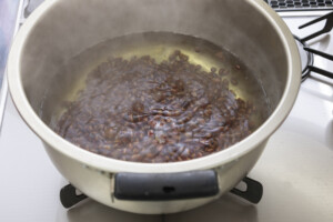 ❶アズキと、たっぷりの水を入れて火にかける。少しやわらかくなるまで30分ほどゆでる。