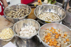 精進料理のため、肉と魚は使いません。逆に、なくてはならないのがアズキです。親鸞聖人が大好きだったというのがその理由ですが、広島では田んぼの畦で作るなど、昔から身近な作物でもありました。しかもアズキを入れることで、うまみもアップします。
