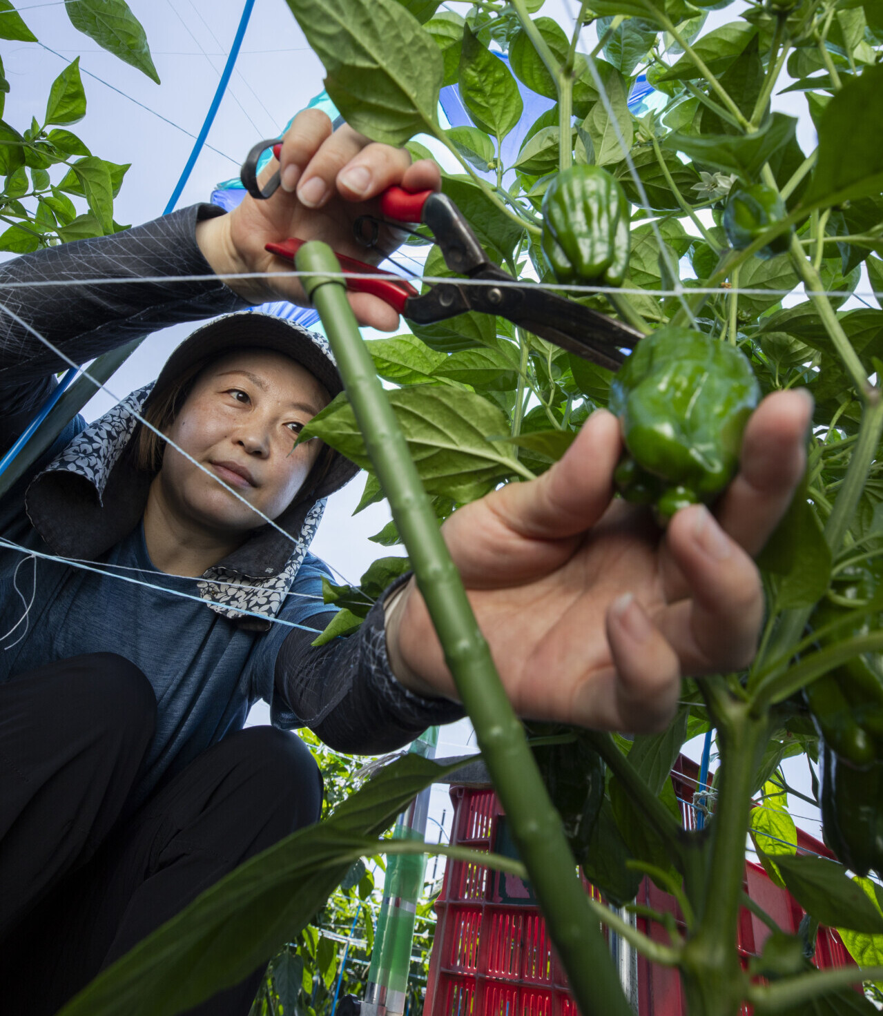 なかでも受講者が増えているのが「ピーマン育成塾」。巡回指導するJA藤坂支店営農経済課・課長補佐の古川麻衣子さんは「小さい面積でスタートでき、軽量で作業しやすい」と理由を説明します。