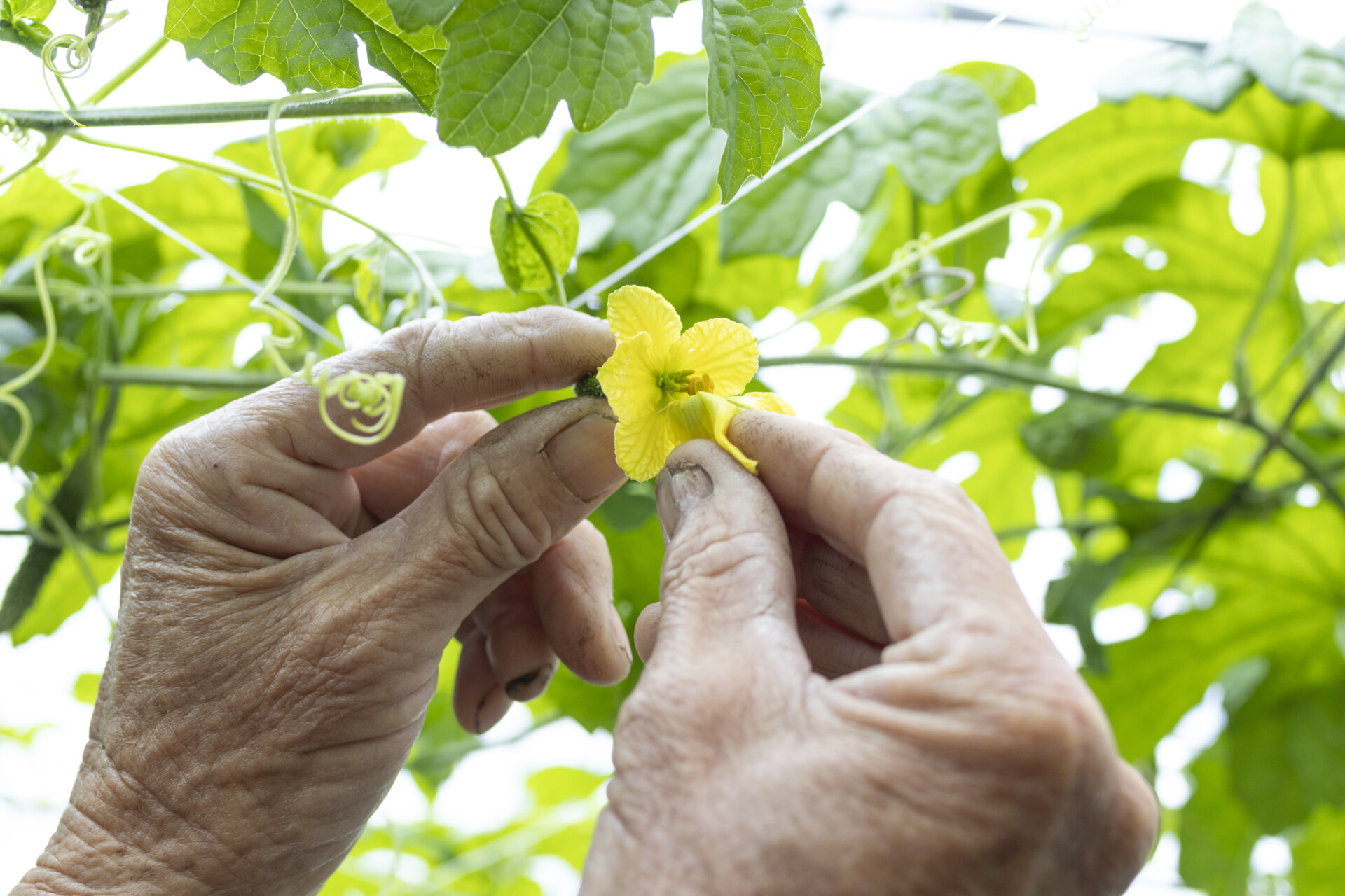 一方、品質を高めるために、こだわっているのは、人の手で受粉させること。雄花を摘み、雌花に一つ一つ、手作業で花粉を付けていくのだ。