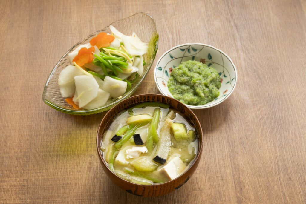 この日のテーブルに並んだのは、ジャガイモ入り「みずかやき」と、ミズの根元を刻み、みそを加えた「ミズたたき」。残ったミズも他の野菜と「浅漬け」に仕立てました。