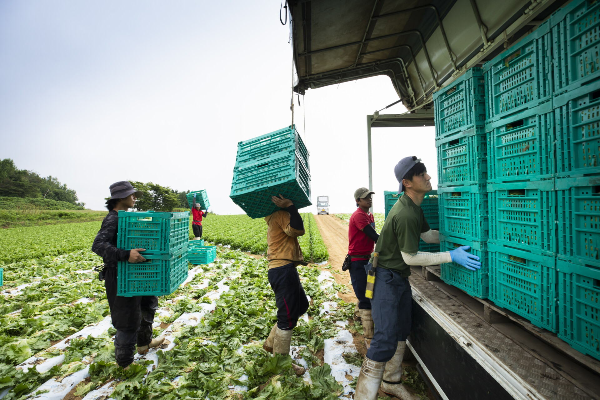 朝四時から太陽の光が強くない八時ごろまでが、収穫のピーク。気温が上がると、しだいにレタスのみずみずしさが損なわれてしまう。収穫されたレタスは、午前中のうちに畑で箱詰めされ、JA新いわて奥中山野菜集出荷所に運ばれる。