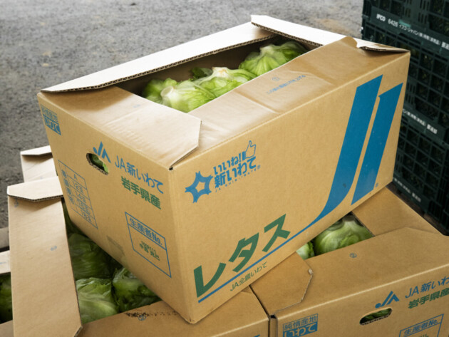 朝四時から太陽の光が強くない八時ごろまでが、収穫のピーク。気温が上がると、しだいにレタスのみずみずしさが損なわれてしまう。収穫されたレタスは、午前中のうちに畑で箱詰めされ、JA新いわて奥中山野菜集出荷所に運ばれる。
