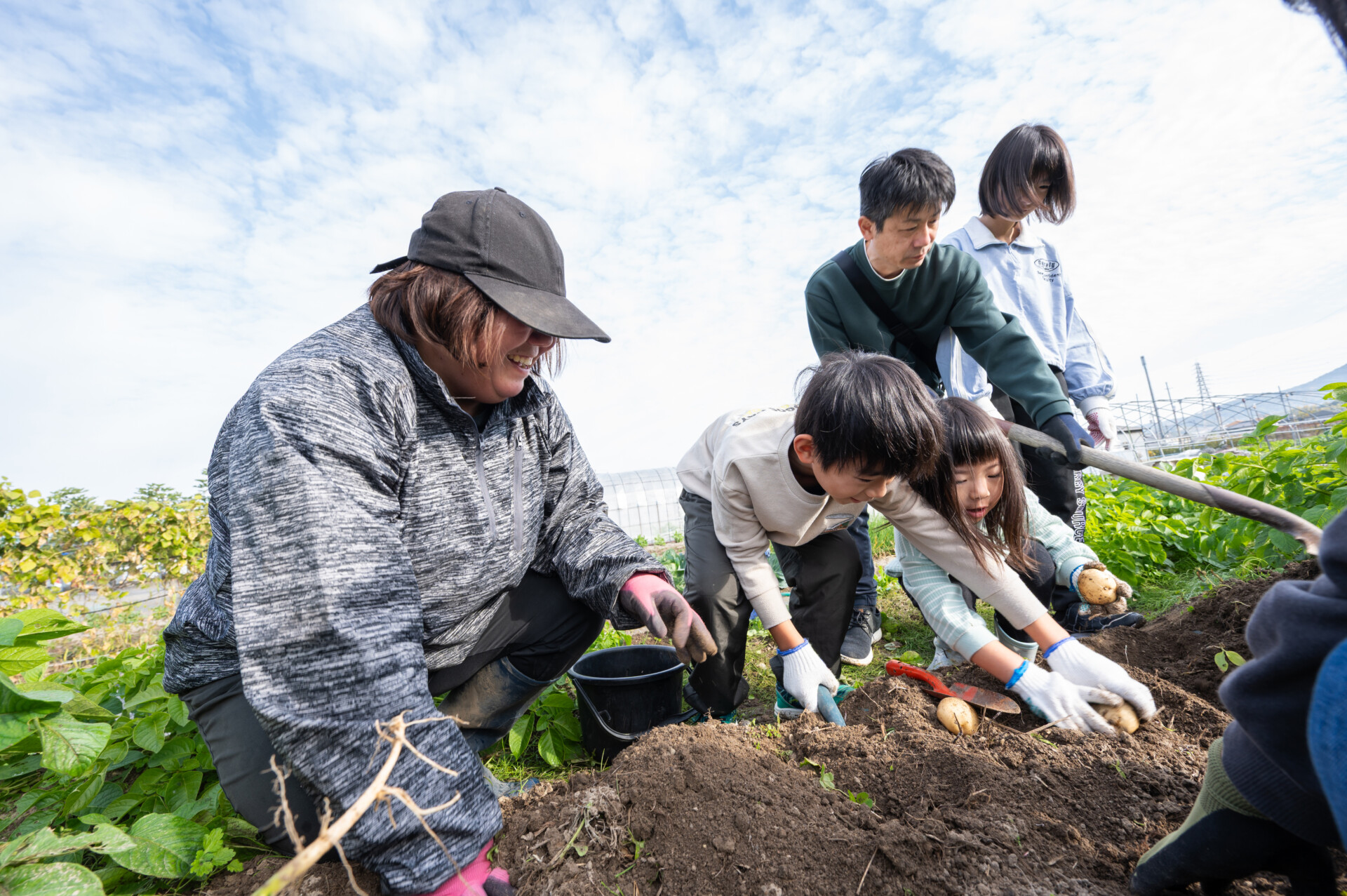 「ジャガイモってこんなに実がつくんだ」と驚く大人のそばで、「畑からカエルが出てきた、こわい!」と子どもたちが声を上げています。